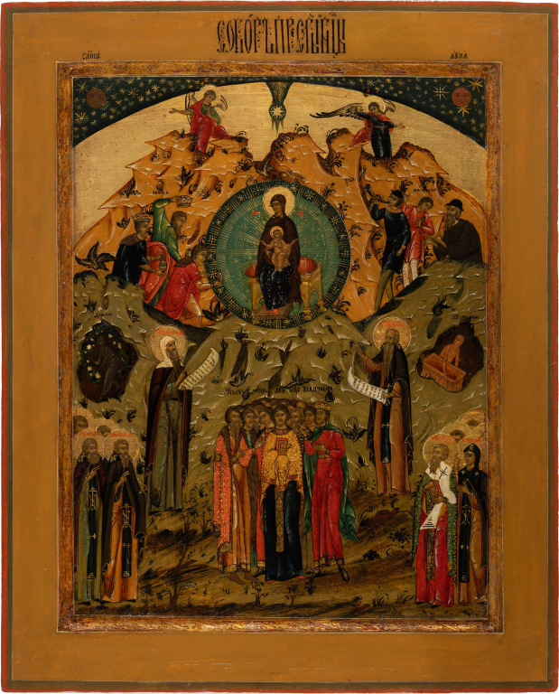 Spodná rovina je ilustráciou stichiry Veľkej večierne sviatku. Pod trojicou mudrcov – mágov stojí prepodobný Ján Damaský. Potvrdzuje to aj csl. nápis v nimbe Іоаннъ Дам (Joann Dam) – Ján Damaský. V ľavici drží rozvinutý pergamen s csl. textom, ktorý vyjadruje to, čo ikona radosť všetkých z Božej Matky. „О тебe радуется обрадованная всякая тварь ангель соборь (O tebe radujetsja obradovannaja vsjakaja tvar anhel sobor) – Z teba milostiplná, raduje sa všetko tvorstvo i zbory anjelov. Tento text na zvitku tvorí úvodné slová modlitby z liturgie sv. Bazila Veľkého. Je to modlitba na oslavu Bohorodičky. Oproti sv. Jánovi Damaskému nestojí prepodobný Kozma Majumský ako na väčšine ikonu tohto typu, ale prepodobný Eutym Veľký (liturgická pamiatka 20.1.). V nimbe má csl. nápis svojho mena Ефимий Ве (Efimij Ve) – Eutym Veľký. V ľavici drží rozvinutý zvitok, ktorého litery nedávajú zmysel a preto je neidentifikovateľný. Domnievame sa, že sv. Eutym sa na ikone objavil ako patrón donátora, alebo toho komu bola ikona určená. Túto hypotézu potvrdzuje prítomnosť ďalšieho svätca s týmto menom v pravom dolnom rohu ikony. Za oboma mníchmi vidíme v útrobách zeme dve ženské postavy. Vľavo za prepodobným Jánom Damaským je personifikovaná postava zeme, ktorá ponúka jaskyňu. Vyjadruje to aj csl. nápis земля (zemľa) – zem. Vpravo za prepodobným Eutymom Veľkým je personifikovaná postava púšte, ktorá ponúka jasle. Nad postavou je csl. nápis пустыня (pustyňa) – púšť. Spodnú časť ikony tvoria tri zástupy ľudí. Vľavo je to skupina prepodobných mníchov, na čele ktorých stojí prepodobný Ján Lestvičnik (liturgická pamiatka 30.3. a Štvrtá nedeľa Veľkého pôstu). V nimbe sa nachádza csl. nápis jeho mena Іоаннъ Ле. (Joann Le.) – Ján Lestvičnik. Za ním stojí prepodobný Sergej Radonežský (liturgická pamiatka 25.9. a 5.7.). V nimbe sa nachádza csl. nápis jeho mena Сергий Ра. (Sergij Ra.) – Sergej Radonežský. Domnievame sa, že jeho prítomnosť na ikone súvisí s udalosťou v jeho živote. Počas Filipovky (Štyridsaťdňový pôst pred sviatkom Kristovho narodenia, ktorý začína 15. novembra a končí v deň sviatku), okolo roku 1385, v noci z piatka na sobotu sa mu zjavila Božia Matka. Bohorodička ho po tom, čo sa modlil pred jej ikonou Akatist uistila, že bude chrániť monastier i bratov. Taktiež zabezpečí všetko potrebné pre monastier nielen počas jeho života, ale aj po jeho odchode. V spodnej časti na vertikálnej osi ikony je zhromaždený početný zástup svätých rôznych stavov. V popredí stojí kňaz s evanjeliárom v rukách. Za ním stojí zástup pozemských vladárov a ostatných ľudí. Nad nimi sa nachádza csl. nápis, ktorý je fragmentom stichiry sviatku Kristovho narodenia Мы же Матеръ Диву Богородицу величаемъ (My že Mater Divu Bohorodicu veličajem) – My sme ti (Kriste) dali panenskú Matku, Bohorodičku, ktorú zvelebujeme. V pravom dolnom rohu stojí posledná skupina svätých. Aj oni sa pripájajú k zástupu všetkých, ktorí oslavujú a zvelebujú Božiu Matku. V popredí stojí biskup mučeník sv. Eutym Sardský (liturgická pamiatka 26.12.) čo potvrdzuje aj nápis v jeho nimbe Евфимий Са (Evfimij Sa) – Eutym Sardský. Za ním stojí prepodobná Melánia Rímska (liturgická pamiatka 31.12.) Domnievame sa, že prítomnosť týchto dvoch svätcov na ikone súvisí s tým, že obaja slávia svoju liturgickú pamiatke v čase sviatkov Kristovho narodenia. Vo vrchnej časti sa na ráme ikony nachádza csl. názov ikony Соборъ Пресвятыя Богородицы (Sobor Presvjatyja Bohorodicy) – Zhromaždenie k Presvätej Bohorodičke.